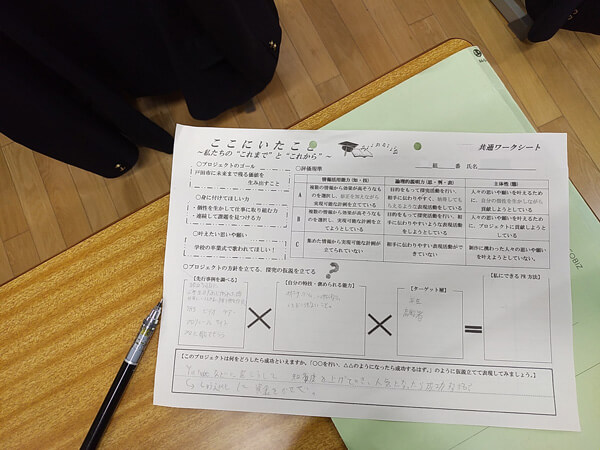 PR方法を考える際は、ワークシート(写真)も使いながら、PRする相手や、自分の得意なことなどを意識しながら考えを深めていきます。ワークシートには、この学習を通して身につけてほしい力や評価規準も書かれているため、自分が何のために、何を、どこまでがんばればよいかを、常に確認しながら学びに向かうことができます。