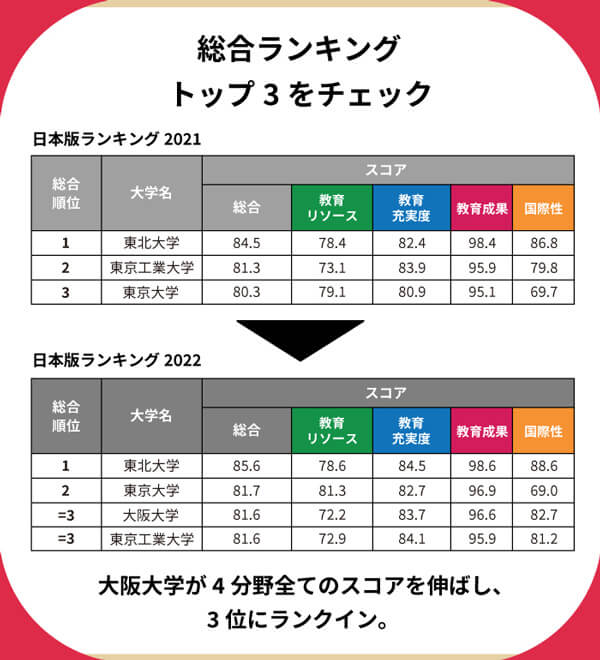 2022年3月24日に発表された「THE世界大学ランキング日本版2022」では、東北大学が3年連続の1位に。2位には東京大学、同率3位には大阪大学と東京工業大学がランクインしました。