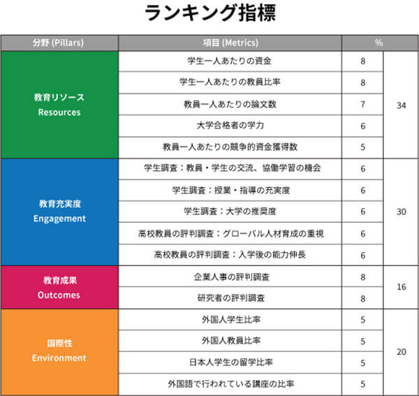 東京大学は「教育リソース」で前年の4位からトップに上がり、総合ランキングで3年ぶりに2位となりました。