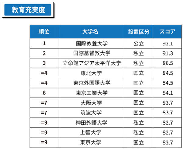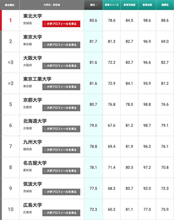 1位の東北大学は「国際性」の順位が6つ上がって9位、国立大学の中ではトップになりました。トップから3位までの差が0.1ポイントずつで拮抗する「教育成果」も3位。「教育充実度」は順位を4つ上げて4位タイ、「教育リソース」は6位でした。高いレベルでバランスの良さを発揮し、3年連続のトップとなりました。