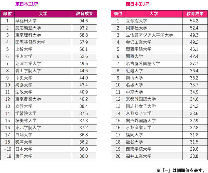卒業生の活躍がどれだけ期待されるかを表す教育成果部門では、早稲田大学が1位、慶應義塾大学が2位という結果で、スコアの面でも他と大きな差をつけました。