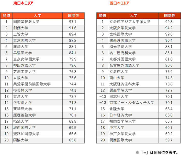 国際性分野では、立命館アジア太平洋大学が1位。国公立大学を含めた全国ランキングでもトップとなりました。芝浦工業大学など昨年よりランクアップした大学にも注目が集まります。