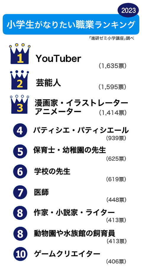 「進研ゼミ小学講座」が実施した「2023年の出来事や将来に関する小学生の意識調査」から「小学生がなりたい職業」の結果をご紹介します。