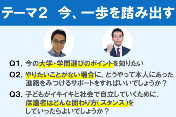 後編では「今、一歩を踏み出す」をテーマに、進路に悩むお子さまがどう進路に向き合い、それに対して保護者はどうサポートすればいいのかを考えます。