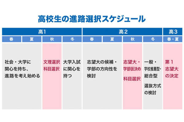 ここでは、高校3年間の進路選択スケジュールのポイントも解説しているので、高1・2生のお子さまが今、そしてこれからどんなことを考えていけばよいのかもわかります。