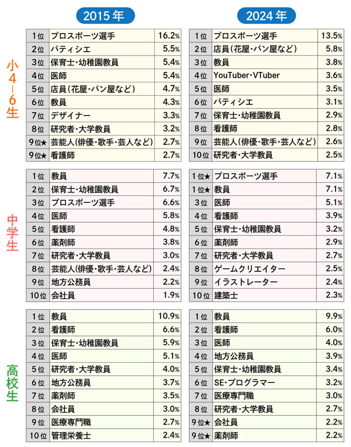 表1:なりたい職業ランキングTOP10(学校段階別、2015・2024年)